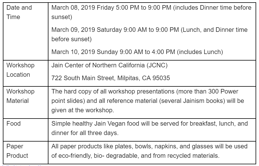 Jain Society of Northern California (JCNC) Milpitas (near San Jose) and the JAINA Education Committee have jointly organized the Jain workshop from Friday March 08, 2019 to Sunday March 10, 2019.