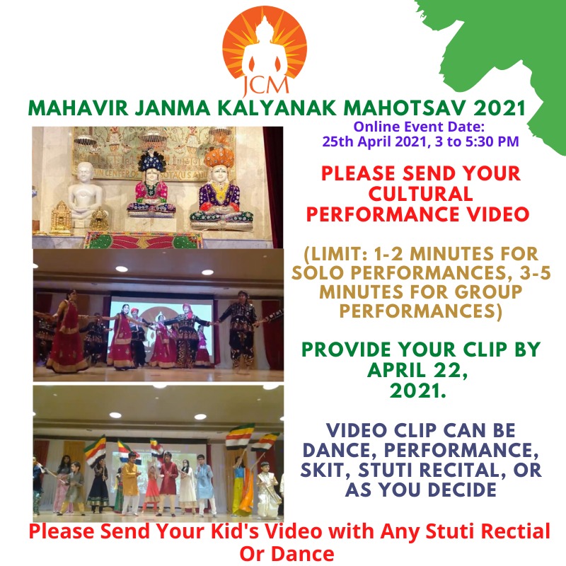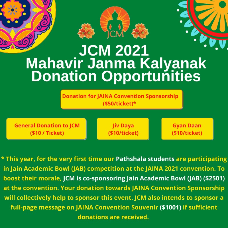 Please join us as we come together both “as a family and a community” in celebrating Mahavir Janma Kalyanak virtually. JCM Board cordially invites you and your family to join “Online” to celebrate together our Mahavir Bhagwan’s Janma Kalyanak. We believe this will help to practice our faith and honor our cultural heritage in a unique way. Looking for your great support like last year.